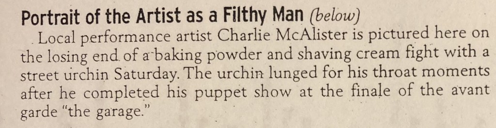 If you have any art or writing by Charlie, or any of his crazy Sardine zines, or any recordings of his music or videos — the folks at Spew Geyser want you to get in touch. They are doing a great job archiving the creative works of this unique Lowcountry artist.